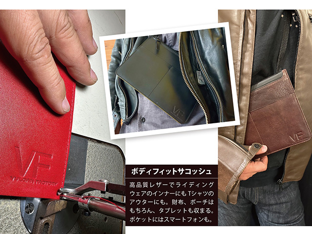 これまで和歌さんは各企業より依頼されたナショナルブランド製品の修理や、有名ファッションブランドのOEMを手掛ける企業をマネージメントしてきた。ここ数年は技術者育成に力を注ぎ、五十代後半を迎えて以前より構想していたモーターサイクルに特化した「自身が欲しいと思う、スタイリッシュレザーアイテム」を製作するVFブランドを2022年に立ち上げた。様々なバイク遊びを経験してきた和歌さんが作るVFのレザーアイテムは、本物志向のベテランライダーを中心に、多くの支持を集めている。