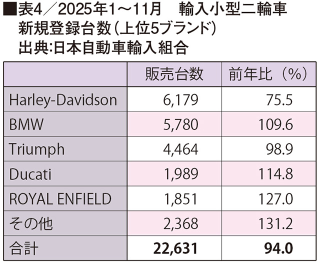 海外メーカーの動向としては、表4にあるように、11月時点ではハーレーダビッドソンがトップをキープ。BMWモトラッドが肉薄しているものの、残り1か月で400台差をひっくり返すのは厳しい感じだ。だが、この状況が続けば、2026年に逆転する可能性はあるだろう。また、前年比微減ながらも、トライアンフも着実に台数を重ねており、公式サイトでは近日公開予定のモデルが数種類あることを予告するなど、2026年も目の離せないメーカーとなっている。期待感を持たせるようなトライアンフのサイト作りは、販売店としてもヒントになるはずだ。