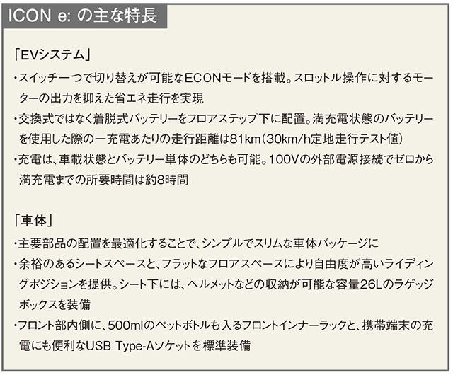 発表会には本田技研工業二輪・パワープロダクツ事業本部のICON e:開発責任者・三ツ川誠氏とホンダモーターサイクルジャパン 商品企画部 商品企画課 ICON e:営業領域責任者・鶴田隆時氏が出席した。説明のなかでICON e:は、インドネシアやベトナムなどのアジア市場を対象にリリースしたが、それをベースに日本市場の原付一種の企画に適合するよう開発を進めてきたことを明らかにした。