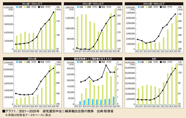 残りのクラスも、500cc超の2クラスほどではないにしろ、年々、台数と金額を伸ばしている。50cc超〜250cc以下の輸出台数は2021年が5万6415台で2025年が7万4547台、金額が54億2756万6000円からこれも100億円超えの138億1257万7000円、単価が9万6200円から18万5300円。