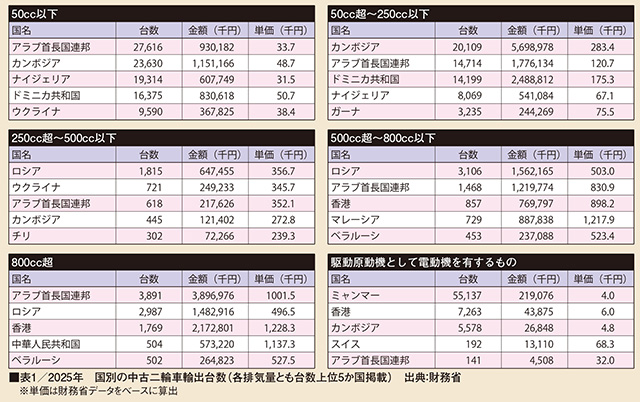 ここまでは排気量ごとのデータだが、表1は輸出している国別にまとめたもの。ただ、例えばアラブ首長国連邦(UAE)への輸出にしても、同国を中継地点(ハブ)として各国にさらに運ばれるので、UAEに二輪車を送っているというデータとなる。