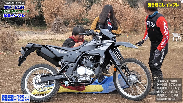 本格的なオフロード走行と日常的な扱いやすさを兼備したWR125Rを、“しゃべり屋ライターバイク乗り”の柴田直美さんと、BDSバイクセンサーイメージガールの竹川由華さんが試乗インプレを行いました! 広報車につき完全に倒した状態は避け、ギリギリまで車体を倒した状態から引き起こせるのかも試しました!