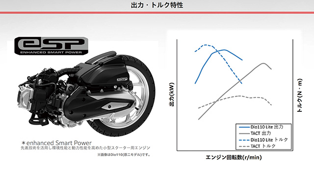 同一エンジンでありながら、出力とトルクに違いがあり、双方とも4.0KWに満たないが、これは110ccベースから出力を抑えるという生産方法が用いられたため。既存の50ccと比較した時に最適な使い勝手となる出力を考えたうえでのことだという。その一方で、ディオ50と比較すると、出力・トルクともに大幅にアップ。これにより比較的スムーズな加速性能を実施している。