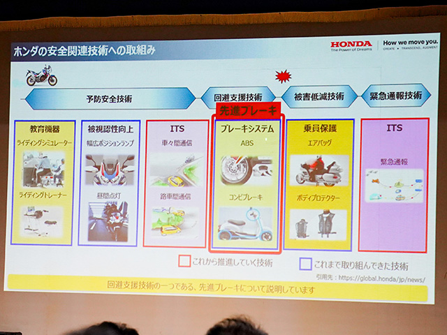 続いて本田技研工業の谷さんは、「ホンダ二輪車安全技術への取り組み 先進ブレーキ編」をテーマに、コンビブレーキやABSといったブレーキシステム開発の経緯などについて紹介。またホンダでは安全目標として、ホンダ車が関与する交通事故の死者数を2030年に2020年から半減、2050年にはゼロを目指していることに言及。今後の展望については、次のように述べた。