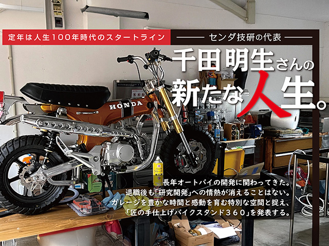 長年オートバイの開発に関わってきた。退職後も「研究開発」への情熱が消えることはない。ガレージを豊かな時間と感動を育む特別な空間と捉え、「匠の手仕上げバイクスタンド360」を発表する。