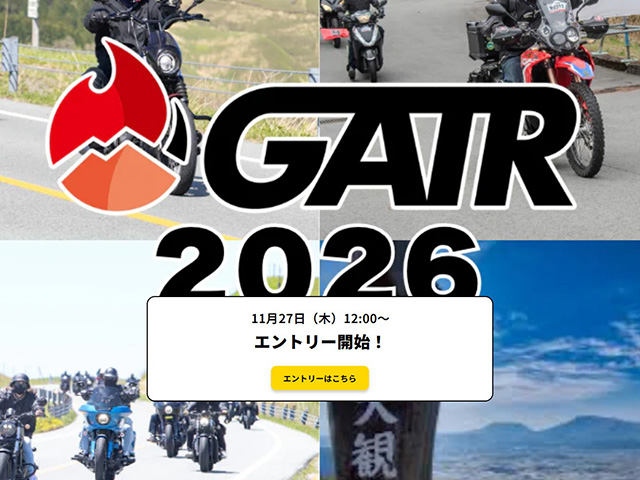 滋賀県の琵琶湖を一周するツーリングイベント『CBTR(セントラル・ビワコ・ツーリング・ラリー)』を主催する『株式会社ご当地ツーリング』は11月27日(木)12時、熊本県の阿蘇を一周するツーリングイベント『GATR2026(グランド・アソ・ツーリング・ラリー)』のエントリーを開始した。ラリー期間は、2026年4月11日(土)から6月7日(日)までが予定されている。同イベントは、バイクツーリングを通じた観光振興が目的の観光ツーリングラリーで、今回が2回目。