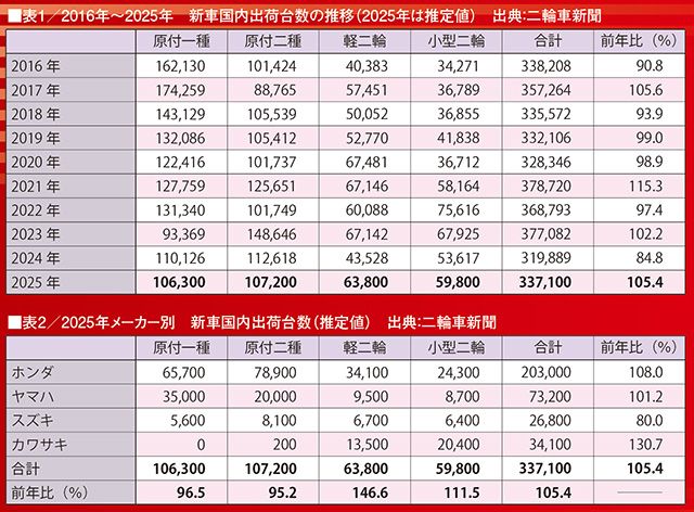 2025年の新車国内出荷台数が33万7100台(推定値 二輪車新聞調べ)となったことが分かった。2024年に32万台を割り込んだことから、今後を占う意味でも2025年はさらに下げるのか、あるいは回復するのかが注目されていた。結果は前年比5.4%増の34万台弱となり、コロナ禍前の2019年を上回る回復ぶりを見せた。