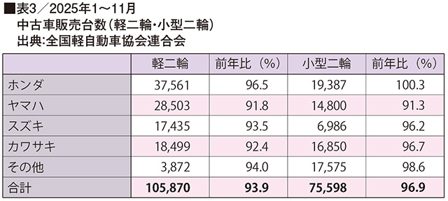 次に中古車市場だが、軽二輪(中古新規)は11万3263 台(前年比5.7%減)で小型二輪が8万0893台(同2.6%減)。マイナス幅は小さいものの、軽二輪は徐々に台数を減らしてきているのが気になる点と言える。