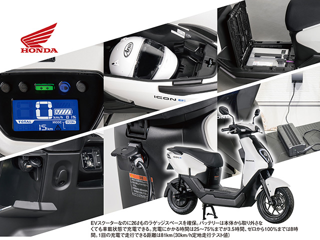 動力用電源には着脱式バッテリーを採用。充電は持ち運びにも便利なコンパクトな充電器を用いて、車載状態とバッテリー単体の二通りの方法を可能とした。ここが最大の特長。駐輪場などでの車両への直接充電はもちろん、バッテリーを取り外し屋内で充電するという2ウェイでの対応も可能となっている。100V外部電源によるゼロからの満充電の所要時間は、およそ8時間だ。