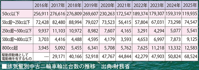 残りのクラスも、500cc超の2クラスほどではないにしろ、年々、台数と金額を伸ばしている。50cc超〜250cc以下の輸出台数は2021年が5万6415台で2025年が7万4547台、金額が54億2756万6000円からこれも100億円超えの138億1257万7000円、単価が9万6200円から18万5300円。
