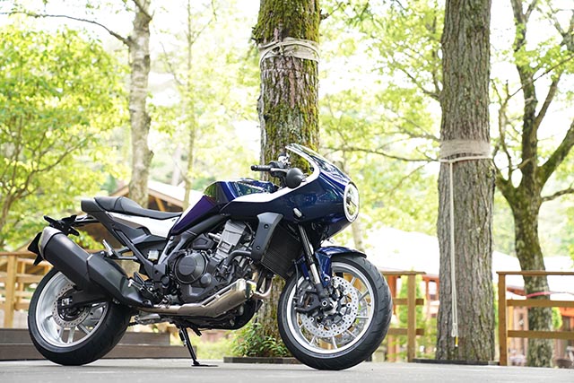 車体は、セミダブルクレードルフレームに前後17インチホイールを組み合わせ、キャスター角を25度に設定。また、マフラーを上向きに配置してバンク角を維持しつつ、セパレートハンドルによる前傾姿勢のライディングポジションとすることで、高いハンドリング性能を確保している。なお、車重は214㎏、シート高は820㎜。