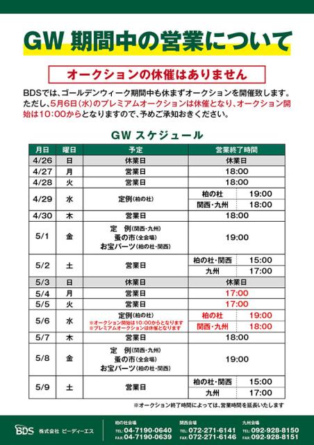 BDSでは、ゴールデンウィーク期間中も休まずオークションを開催致します。ただし、5月6日(水)のプレミアムオークションは休催となり、オークション開始は10:00からとなりますので、予めご了承おきください。
